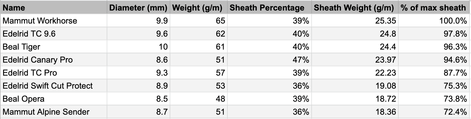 Using the above table, we can see that the thickest rope does not have the most sheath material. When we compare the Canary to the Mammut Workhorse, we find that it actually only has 5.5% less sheath material despite weighing 22% less. That's incredible!