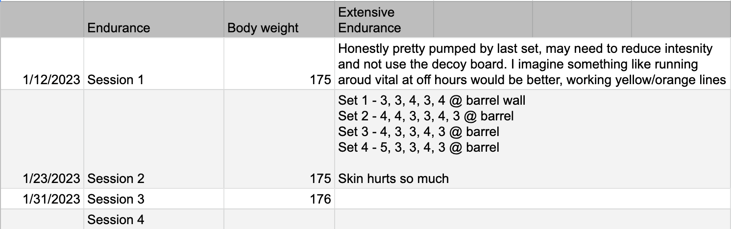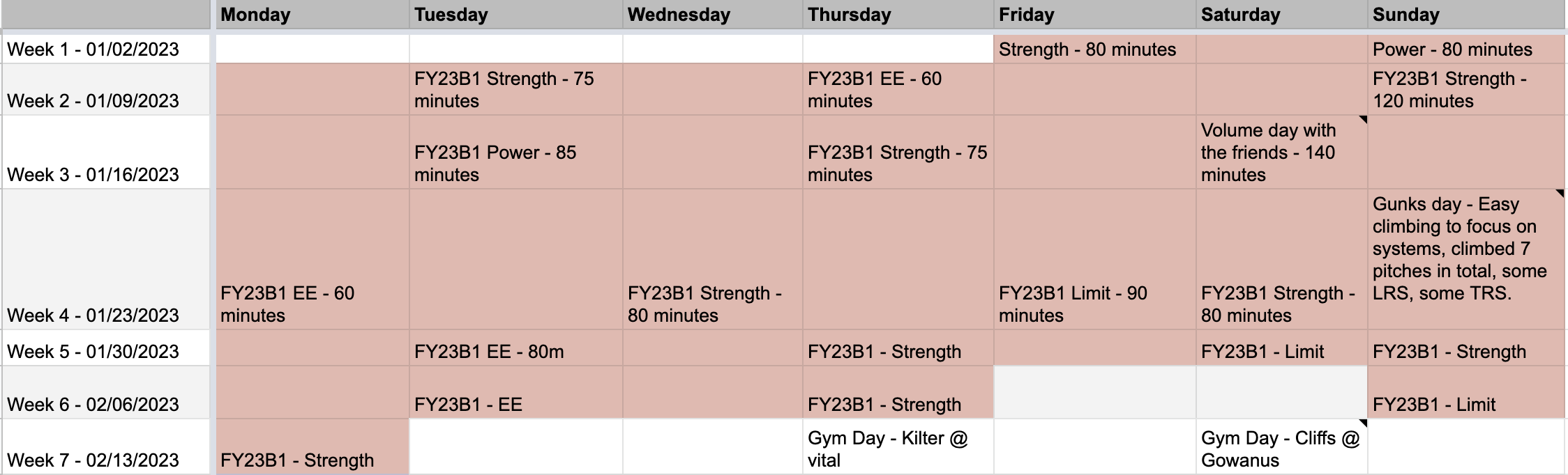 Where am I at? Over the last 4-6 months, my training/climbing volume has dropped significantly to where in the months of November and December of '22, I got three sessions of climbing in. However, as we expect to take 4 weeks off of climbing to deload (Bechtel), a month off is not disastrous. I may feel like I'm far behind when I begin climbing again, but I reckon it's not as bad as it feels. My skin is also non existent which is something I’m taking into consideration.