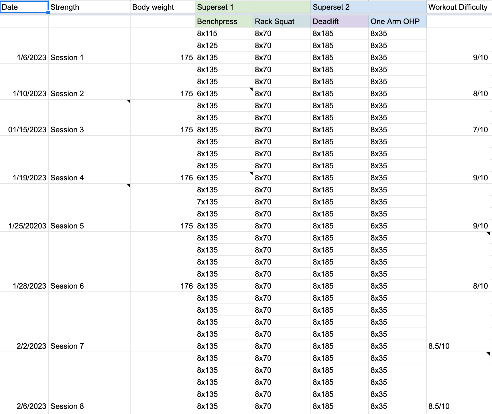 After getting in 16 sessions in the last month, I want to build general strength and power while also continuing on the thread of capacity. I just started my general strength block, so I'll post about it after it's over.