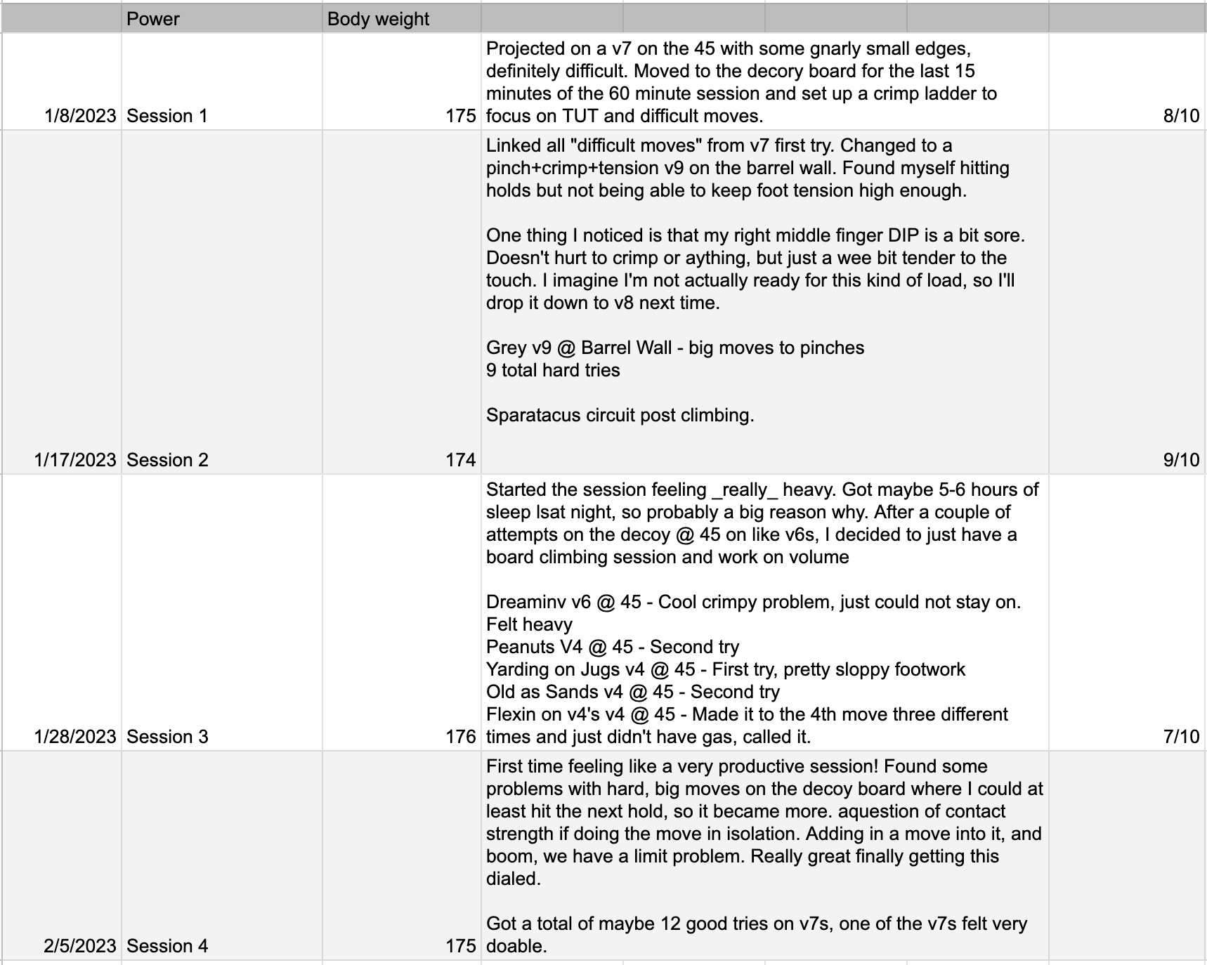 - Time on the wall linking more moves would be better combined with a full body power workout. Like, I think trying to shift to more time-on-the-wall climbing would be really useful and do more full body power workouts.